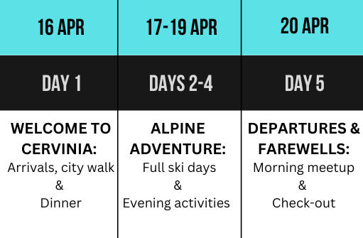 π― Any activities not mentioned in the programExperience the majesty of the Alps, perfect your technique, and create unforgettable memories in one of Europe's most prestigious ski destinations!Limited spots available - Book now to secure your Alpine Adventure!
